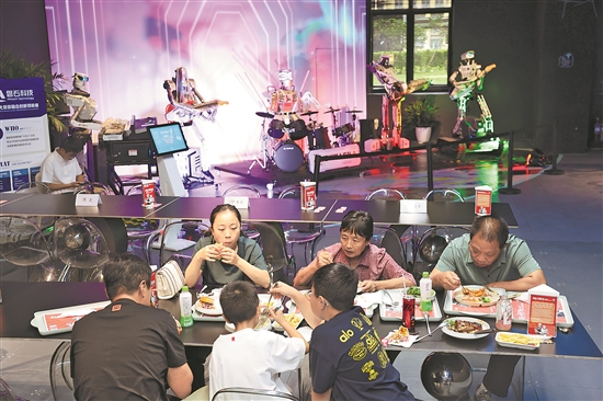 8月13日,在北京首家机器人主题餐厅内,顾客边听机器人乐队演奏边就餐。