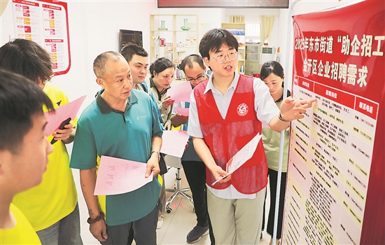 日前,安徽省六安市金安区东市街道建来社区工作人员向辖区居民和新就业形态劳动者介绍企业用工信息。据悉,金安区相关部门积极采取“线上+线下”等多项举措,及时把“就业福利”送到居民家门口,既缓解企业招工难,又帮助群众实现就地就近就业。本报通讯员 田凯平 摄