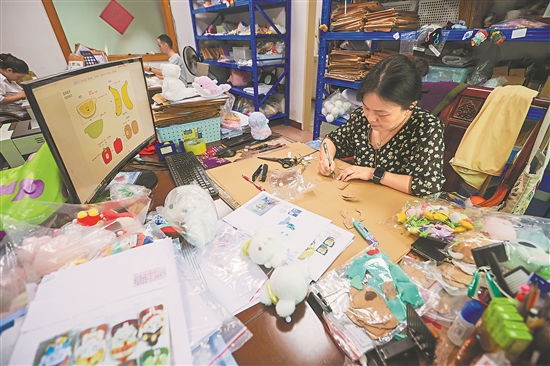 8月11日,在广东东莞奇骏玩具工厂,师傅按设计图裁出纸样。