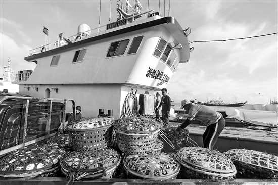 近期,这里每天约有2000吨梭子蟹到港,经过分拣、绑扎后发往各地市场。