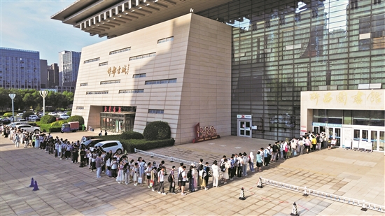 近期,河南许昌市民阅读热情高涨。该市图书馆开馆前,读者在图书馆门前排起长队等待进馆。牛书培 摄/中新社