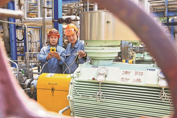 在当前的高温多雨季节,齐鲁石化运维中心强化设备日常运行管理。图为8月7日,该中心炼油电气车间电气七班员工正在测量制氢装置进料泵的振动与温度值。李建强 摄