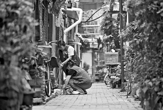 今年以来,天津市和平区通过组织下沉干部、社区工作人员和志愿者的力量,针对老旧小区卫生死角、杂物乱堆乱放及共享单车乱停放等突出问题进行重点整治,完善社区基础设施,宣传引导居民养成良好卫生习惯,擦亮老旧小区和胡同街巷“颜值”,改善人居环境,提升城市品质。图为社区工作人员和志愿者清理胡同的卫生死角。新华社记者 赵子硕 摄