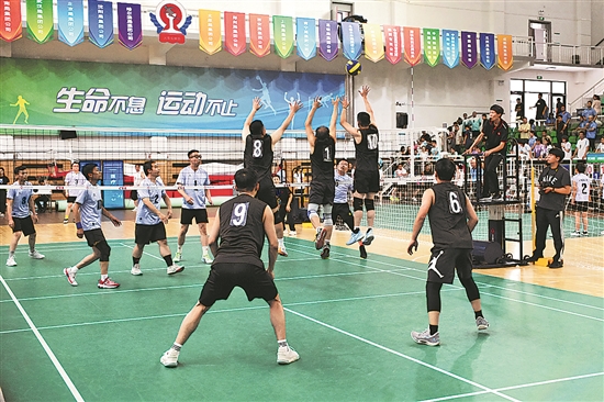 近日,中国铁路太原局集团有限公司大同电务段工会举办“奋进改革新征程、建功铁路现代化”职工运动会,进一步激发全民健身运动的热情,提升健康素养,增强团结奋发向上的凝聚力。图为参赛选手在此次运动会气排球赛场上激烈对抗。本报通讯员 何思远 摄