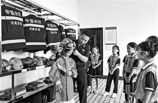 8月16日,河南省济源市文昌路小学的学生在济源市济水同心街消防救援站体验穿戴灭火防护装备。