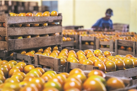 每年8月至9月,巴西各地橙园进入收获季节。巴西是全球最大的橙汁生产国和出口国之一,在国际市场上占有重要地位,其产品远销世界各地。图为近日在巴西里约热内卢州坦瓜市,工人在一处橙子分拣中心工作。 新华社记者 王天聪 摄