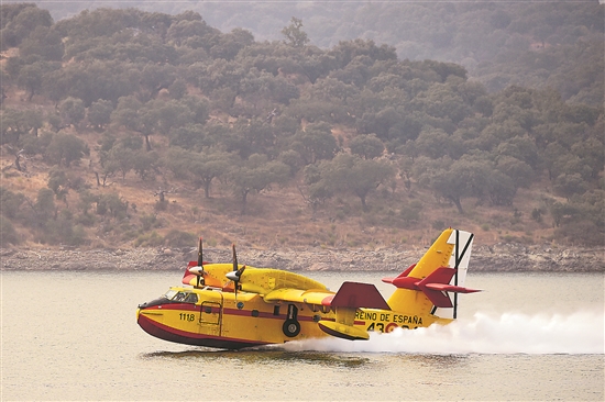 当地时间8月18日,在西班牙卡塞雷斯省,参与灭火的飞机正在取水。
