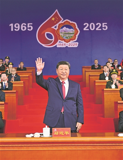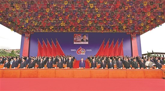 王沪宁发表讲话。他说,1965年9月,在党中央亲切关怀和党的民族政策光辉照耀下,西藏自治区宣告成立。这是西藏发展史上具有划时代意义的大事,巩固了西藏和平解放和民主改革的伟大成果,实现了西藏社会制度的历史性跨越。60年来,西藏经济社会全面发展,民族区域自治制度成功实践,民族团结日益巩固,各族人民生活蒸蒸日上,充分展现了中国共产党领导的坚强力量,充分展现了我国社会主义制度的显著政治优势。