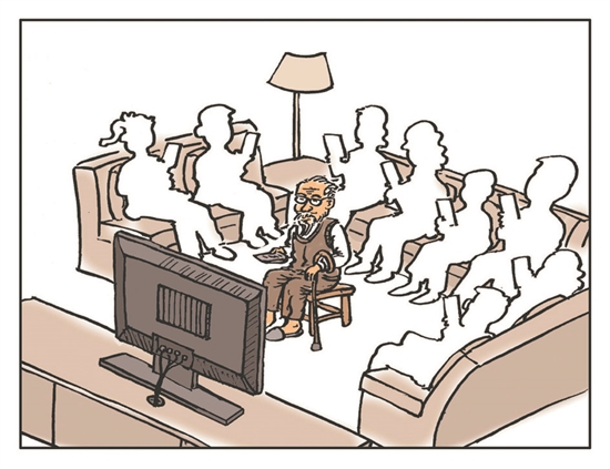 漫画《独享》,记录了当下老年人的一种生活状态。其实,类似状态也存在于社会生活当中。某地某长某热线电话,是否沦为摆设?某官下基层调研,有没有把基层群众当成摆设?还有那些中看不中用的各种面子工程……