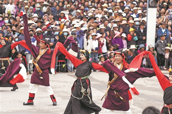 8月20日,青海省玉树藏族自治州囊谦县,演员们正在街头表演国家级非物质文化遗产——囊谦卓干玛,迎接参加2025澜湄国际影像周的中外嘉宾。