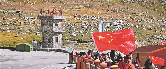 8月21日,新疆帕米尔高原之上,海拔4700多米的红其拉甫哨所原址,成了游客奔赴的热门打卡地。一群游客手持五星红旗,在哨所前有序排队拍照合影。这里曾是边关卫士坚守的阵地,如今吸引着来自天南海北的游客。本报记者 苏墨 摄