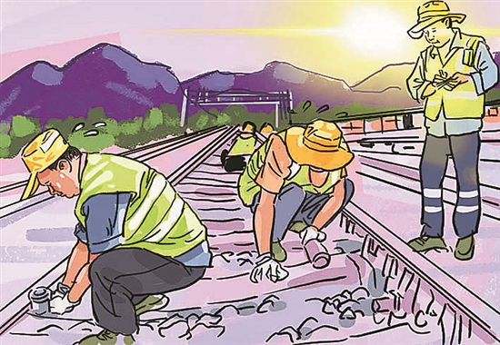 当天,室外气温已超过40摄氏度,编组场的铁轨被晒得烫脚,高山桐带着维修组的同事,在纵横交错的股道间,不断重复脚踩、弯腰、下蹲、探身等动作,90分钟里,需要重复这样的动作9000余次,全程大约要走14.4公里。