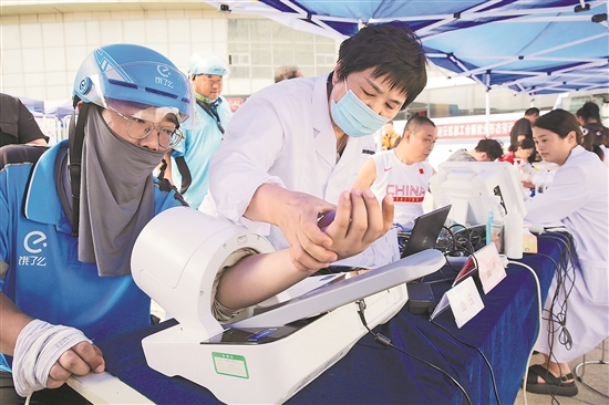 8月25日,江苏省连云港市,由江苏省总工会选派的医疗卫生团队在给新就业形态劳动者进行健康检查。