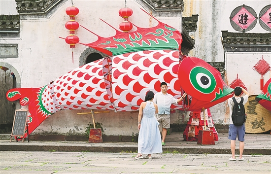 近日,游客在黄山市徽州区呈坎村体验非遗鱼灯。