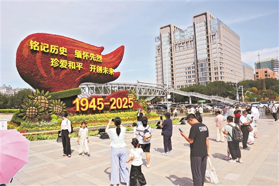 连日来,位于北京长安街沿线的纪念中国人民抗日战争暨世界反法西斯战争胜利80周年主题花坛吸引人们打卡拍照。图为市民在北京街头驻足观看“薪火相传”主题花坛。本报记者 王伟伟 摄