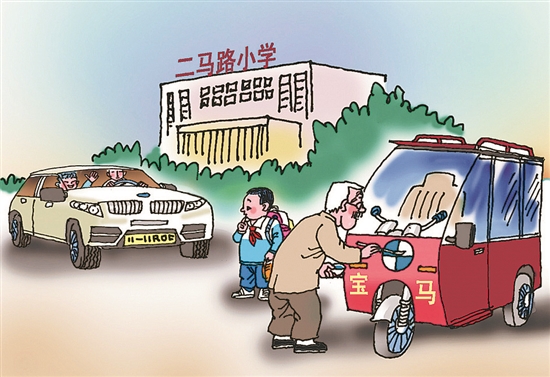 在漫画家刘二励笔下,就有这样一名小朋友,面对同学家的豪车,他羞愧难当,不知所措,以致难为了他的爷爷。而爷爷毕竟见多识广,毕竟经历过无数窘境,他没有被难堪征服,他利用自己手中的画笔,“创造”性、“零成本”地将接送孙子的三轮摩托顷刻间“升级”为私人订制版名车。