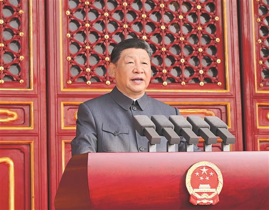 9月3日,纪念中国人民抗日战争暨世界反法西斯战争胜利80周年大会在北京天安门广场隆重举行。中共中央总书记、国家主席、中央军委主席习近平发表重要讲话。新华社记者 谢环驰 摄