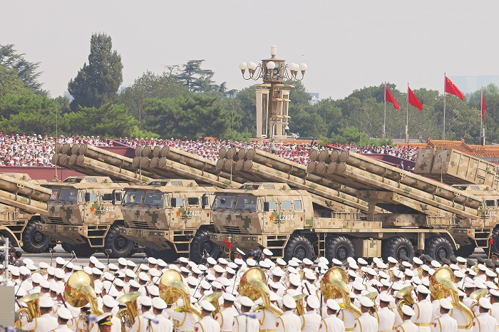 远程火炮方队驶过北京天安门广场。受阅的两型191远程箱式火箭炮,集战役打击、战术支援为一体,拓展陆战能力新边界。本报记者 王伟伟 摄