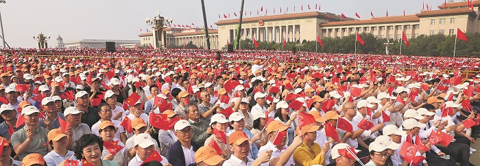 9月3日,参加纪念大会的观礼群众与现场合唱团一起高唱抗战主题歌曲。本报记者 王伟伟 摄