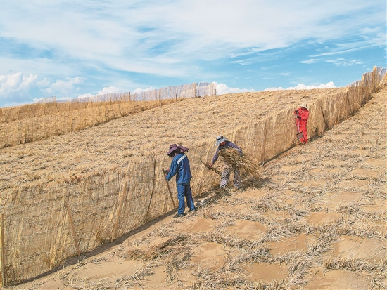 近日,甘肃省酒泉市金塔县黑河中游防沙治沙林草综合治理项目工程固沙现场,治沙工人正在起伏的沙丘上铺设草方格沙障、搭建高立式沙障。