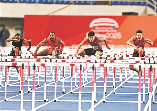 在男子110米栏决赛中,陈圆将(右二)以13秒27获得季军。本报记者 王羡茹 摄