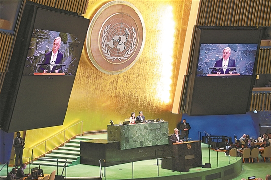 第80届联合国大会当地时间9月9日下午在纽约联合国总部开幕。新一届联大的主题是“携手共进:促和平、发展、人权八十载,继往开来,再谱新篇”。图为当日联合国秘书长古特雷斯在第80届联大第一次全会上讲话。