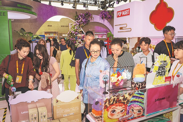 9月11日,在北京首钢园举行的2025年服贸会文旅服务专题展上,多家潮玩企业带着新产品集中亮相,吸引了众多观众前来参观、体验。
