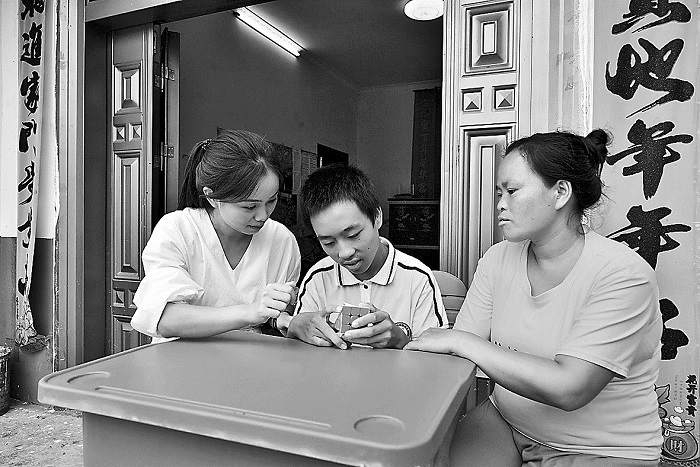 9月8日,在湖北省襄阳市保康县歇马镇尚家坡村,该县特殊教育学校教师庄旭和同事送教上门,为一名残疾儿童做康复训练。