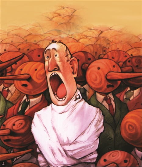 国外童话将撒谎者喻为长鼻人。眼前这位先生被他们包围着,四周充斥着虚假信息和流言蜚语,要摆脱需要清醒与勇气。
