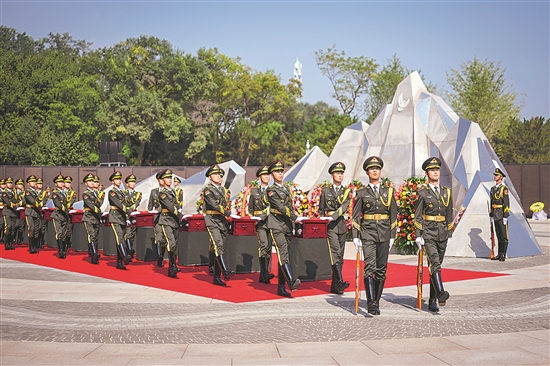 9月13日,礼兵护送志愿军烈士棺椁走向沈阳抗美援朝烈士陵园安葬地宫。