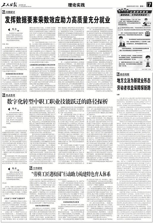其一,加强“三个精神”理论教育,推进课程体系系统化完善。一是从历史传承角度,梳理“三个精神”发展脉络,开发专题课程。二是从时代价值角度,聚焦现代产业体系,丰富活动内容,激励广大青年走技能成才、技能报国之路。三是从实践创新角度,增强数字技术赋能,实现从线下到线上的一体化建设。可建立“云端劳模课程库”,运用VR技术还原劳模工作场景;采取有效措施鼓励思政课教师和劳模工匠开发“三个精神”主题慕课。