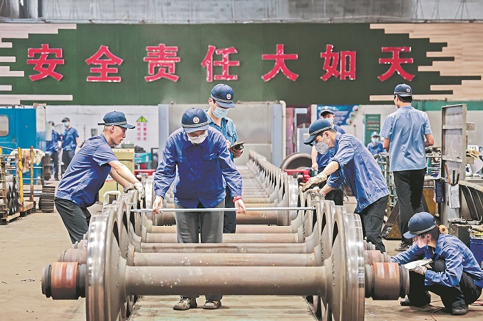 为确保优质车源及时上线运行,中国铁路南昌局集团有限公司南昌南车辆段抓好轮轴、转向架、车钩等关键环节检修质量,排除安全隐患风险。图为班组职工正在进行轮对检修作业。陈松 摄