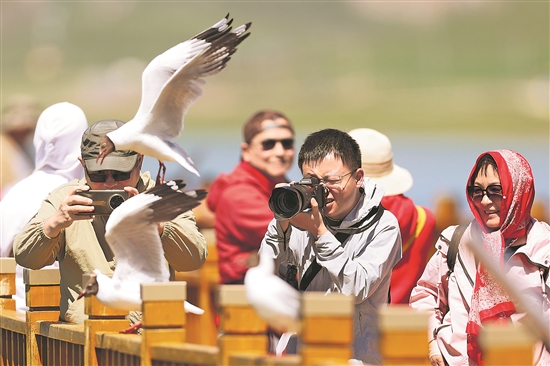 图为游客在甘肃省甘南藏族自治州碌曲县尕海湿地近距离拍摄、观赏棕头鸥。