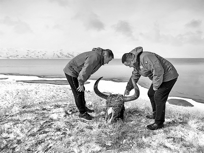 2023年10月16日,巡护人员在新疆阿尔金山国家级自然保护区内查看死亡野牦牛的头骨。新华社记者 李响 摄