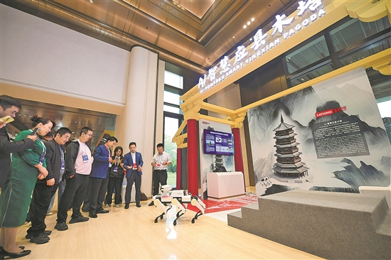 9月17日,与会嘉宾在论坛的文化遗产数字化精品项目展上了解AI智慧应县木塔数字化保护项目。