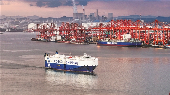 这是一艘海轮驶离钦州港(9月16日摄,无人机照片)。