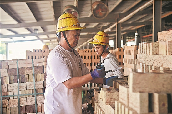在福州闽侯县一家建筑垃圾资源化利用企业的生产园区,一批建筑垃圾制作的砖块烧制完成,工人们在筛选、捆扎(9月13日摄)。