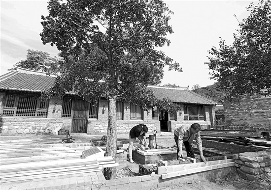 9月17日,工人在河北省秦皇岛市抚宁区大新寨镇界岭口村的一处民宿改造工地施工。