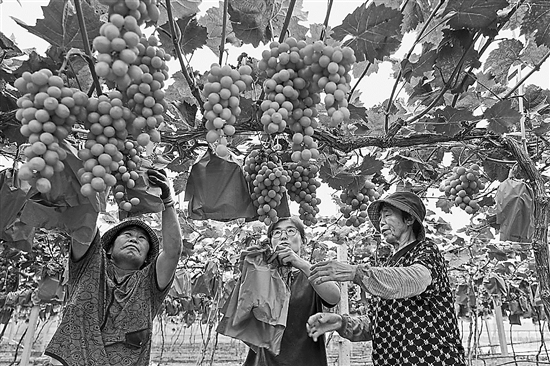 9月16日,村民在山东省肥城市老城街道河口村的肥城市河兴农业专业合作社葡萄草莓种植基地收获葡萄。