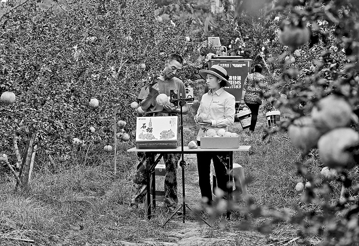 9月18日,在云南省永胜县三川镇,永胜县邮政分公司的工作人员正在进行直播带货,帮助果农售卖刚刚采摘的石榴。永胜所产的软籽石榴是国家地理标志产品,预计 2025年总产值将突破7亿元。