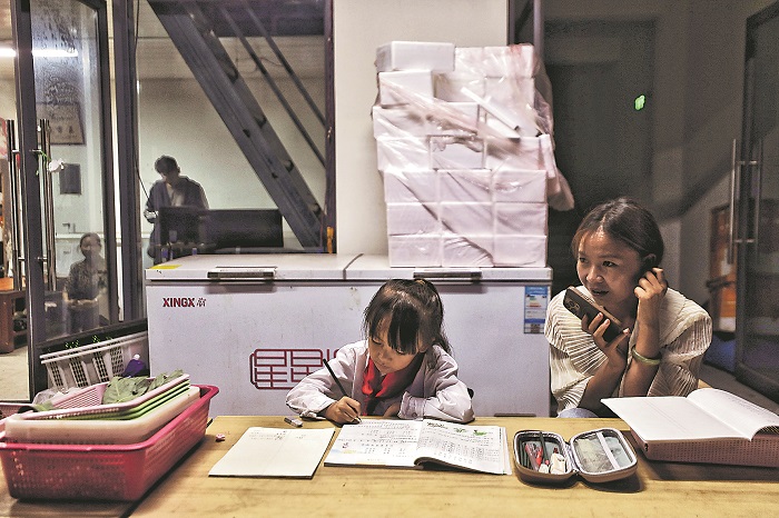 9月17日晚9点,商户周丽萍一边打电话联系业务,一边陪刚上二年级的女儿写作业。