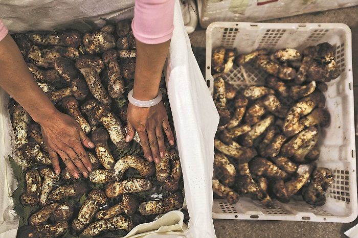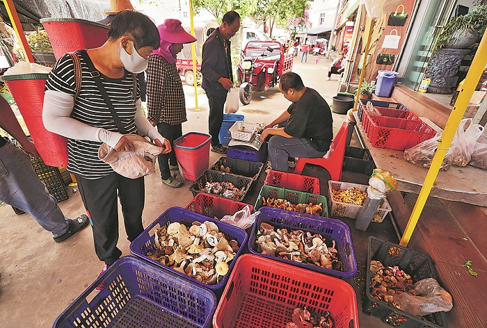 9月16日,南华县的一处集市上,附近村民将当天采摘的新鲜菌子拿到市场售卖。
