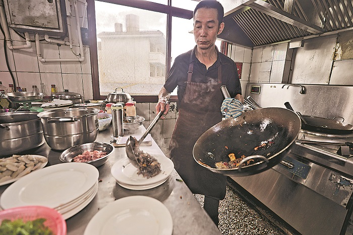 9月17日中午,在南华县的一家餐馆后厨,现炒的菌子新鲜出锅。