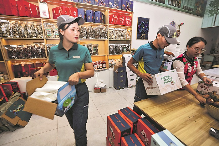 9月16日晚,南华邮政分公司的工作人员上门服务,帮助商户打包寄递菌子。