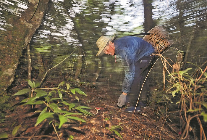 9月17日早晨7点半,在云南省楚雄彝族自治州南华县菌子山,55岁的郑华东一大早进山采摘新鲜的野生菌。