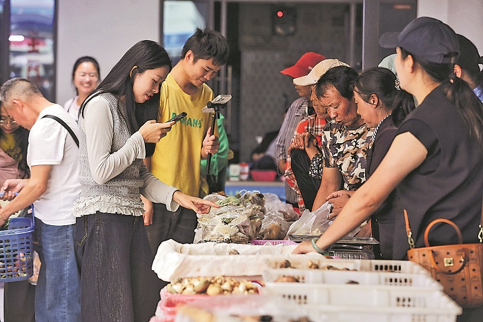 9月17日,南华国际野生菌交易中心,两位年轻主播在市场里直播带货。