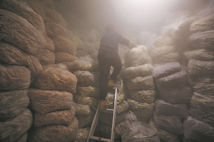 9月16日晚,62岁的周培彪在零下20多摄氏度的冷库中归置收购来的野生菌。