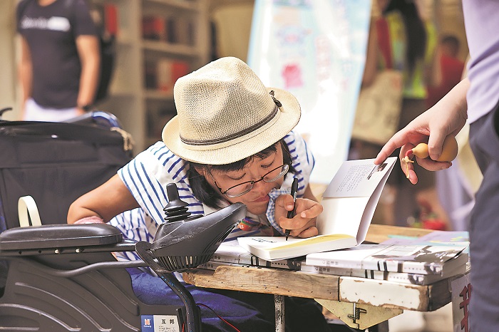 每一个决定买书的人,洛洛都会为他们签名。她只有左手的两根手指能微微使力,每次都得麻烦别人帮忙拔开笔帽。她在手腕上系了一根发圈,用牙齿咬住,借一点力抬起左手,然后一笔一画、工工整整地写下自己的名字。