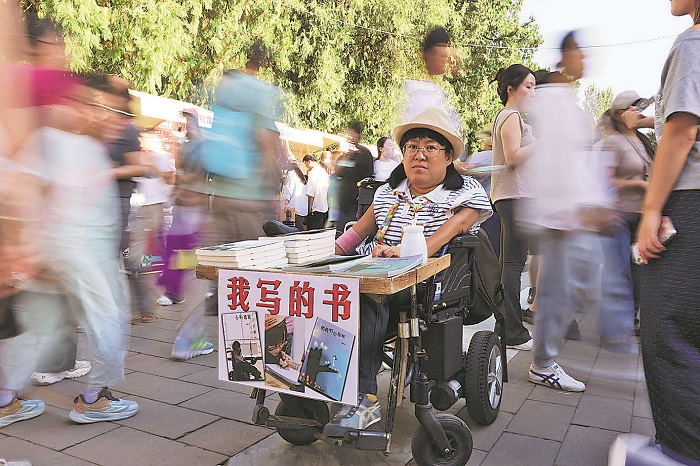 9月14日下午,北京地坛书市人潮涌动,她静静地坐在轮椅上,视线低低掠过人群腰际。从这个高度望出去,世界仿佛被压缩成一片晃动的衣角和匆匆的脚步,她时常被淹没在人来人往的投影之下。等有人驻足停留时,她会轻声地对前来打量的人说:“这是我写的书,可以拿起来看看。”