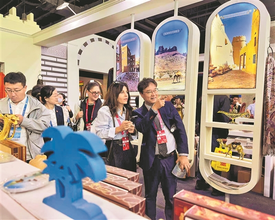 图为来自韩国和意大利的宾客在展会现场交流。本报记者 康劲 摄